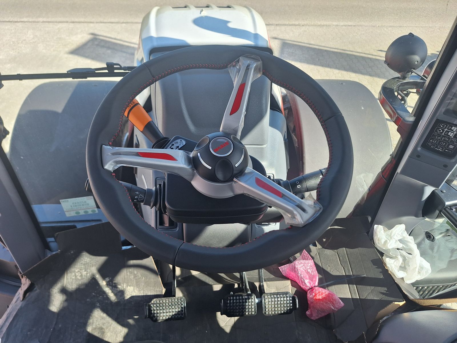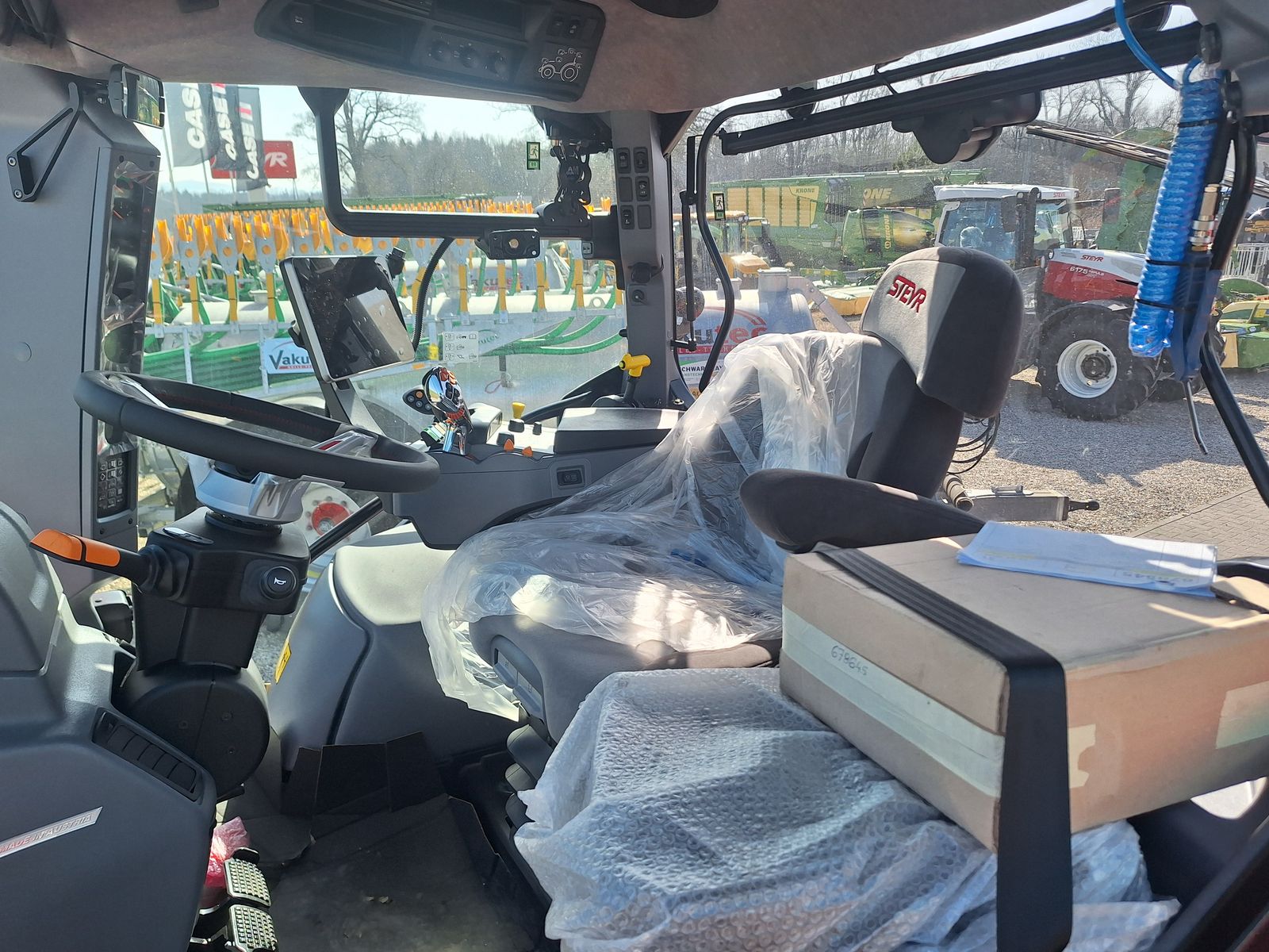 - mit Komfort-Kabine: luftgefederter Fahrersitz mit Stoffbezug (Grammer Dual Motion), Niederfrequenz Federung DDS, Aktivkohle-einlagen,2-stufige Fahrersitzheizung, Beifahrersitz (Stoff), Standardlenkrad, manuelle Klimaanlage, mechanische Verstellung der Bedienarmlehne