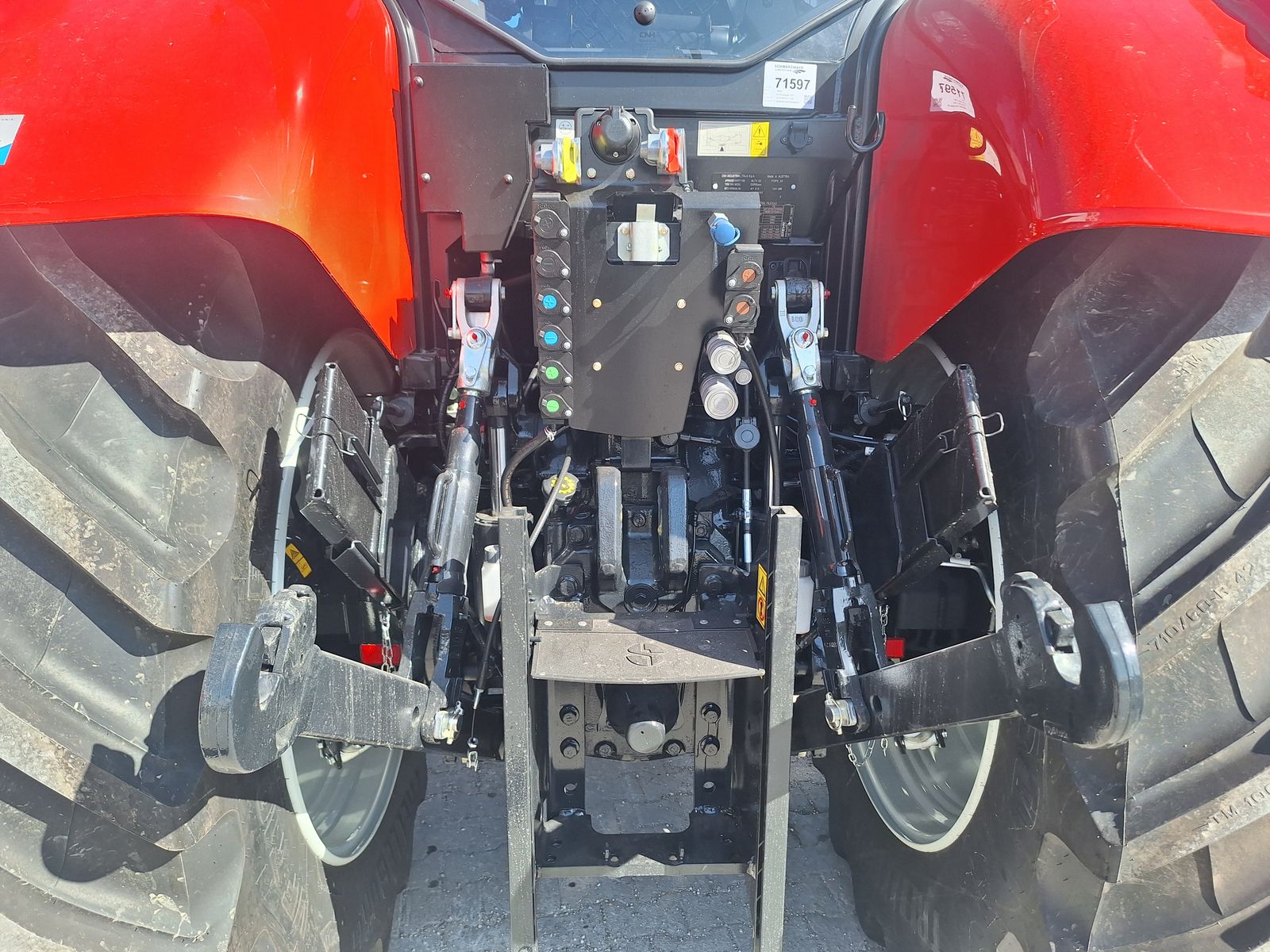 - mit Heckhubwerk Kat. 3 mit 2 außenliegenden Hubzylindern :e 100 mm und Schnellfanghaken (8647 kg max. Hubkraft) mit mechanischem Oberlenker